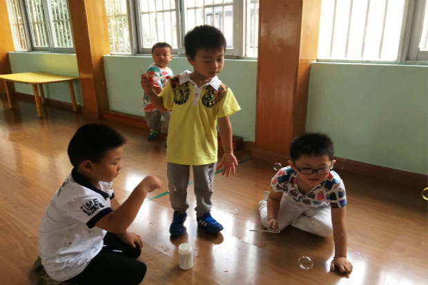 “你看!我吹的泡泡好大呀!”“我吹出来的泡泡是彩色的!”“哈哈,好圆的泡泡呀!”2016年9月7日上午,娑罗巷幼儿园的多功能教室里,孩子们正在进行吹泡泡活动。