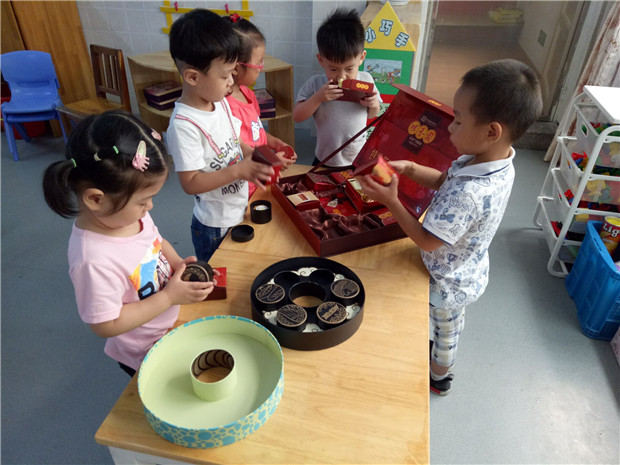 月饼是团圆的象征,是中秋佳节的必备食品。孩子们对月饼的向往还是难以阻挡的。他们在老师的带领下有序地欣赏精美的月饼拼盘,豆沙的、椰丝的、莲蓉的、鲜肉的、水果的、蛋黄的……就像一件件艺术品,可谓赏心悦目,令人馋涎欲滴。孩子们伸出小手去摸一摸,用小鼻子闻一闻,还有的孩子忍不住馋,偷偷捏一块含在嘴里。不少孩子还用彩泥制作了自己心目中的月饼,期待与家人分享。