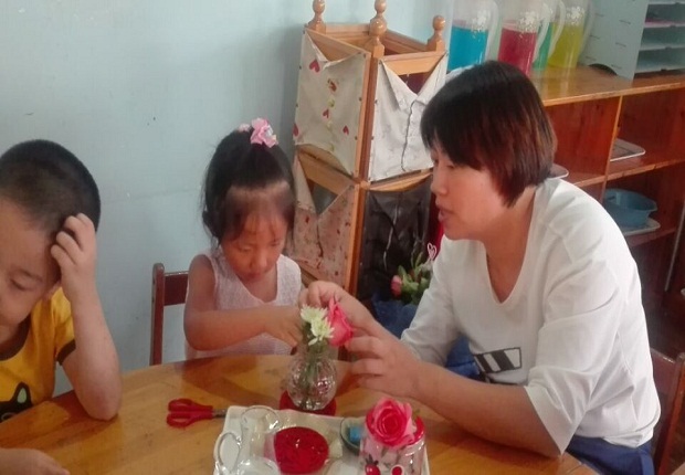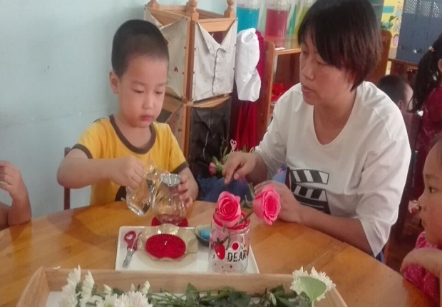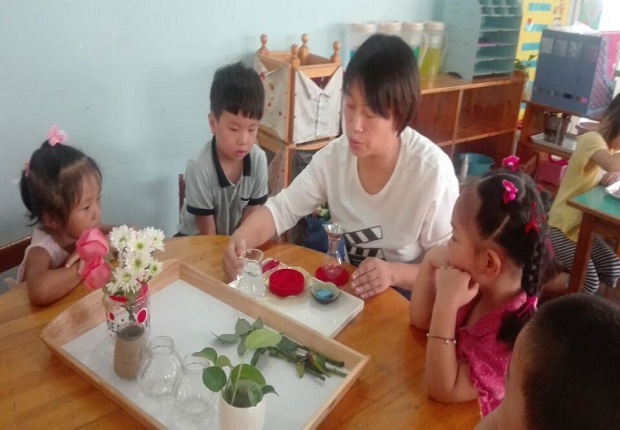 “老师,花好香啊”。“把花插在花瓶里真漂亮。”“我要把插好花的花瓶放在哪里呢”?教室里孩子们你一句,我一句,原来又到了蒙氏活动时间,今天老师要教我们的工作是插花。