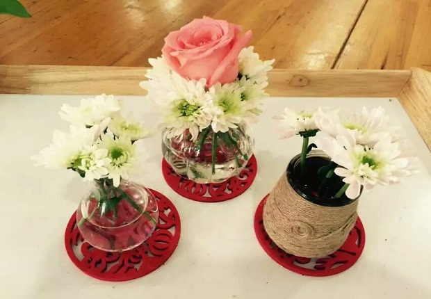 工作开始了,老师取出了托盘。哇,托盘里怎么放了这么多东西呢?有已经插好各种各样五颜六色鲜花的花器,形状不一的玻璃花瓶,放有花瓶垫的方形藤编篮,取水壶,小漏斗,玻璃碗和小海绵,看到这么多的插花工具,小朋友都很好奇,到底插花的工作应该怎么做呢?首先,拿出取水壶去取水,把漏斗插在玻璃花瓶里,将取水壶的水顺着漏斗壁慢慢倒入玻璃花瓶中,其次从玻璃碗中取出海绵把残留在托盘和漏斗中的水擦干净,然后从花器中取出一枝鲜花,插入玻璃花瓶中,如果想多插几枝鲜花,那就要多操作几次了。这样,我们的插花工作就算完成了,最后别忘了从藤编篮中拿出花垫垫在已经插好花的玻璃瓶底下。介绍完了工作之后,小朋友一个个都迫不及待地想要试一试,很快,经过小朋友的巧手,玻璃花瓶里插满了各种各样的鲜花。在老师的指点下,孩子们把花瓶放在了教室的各个地方,用来点缀教室,使之焕然一新。