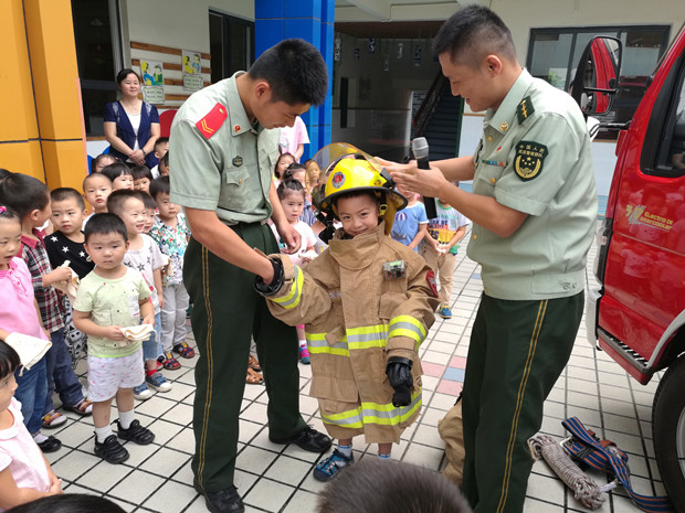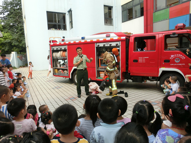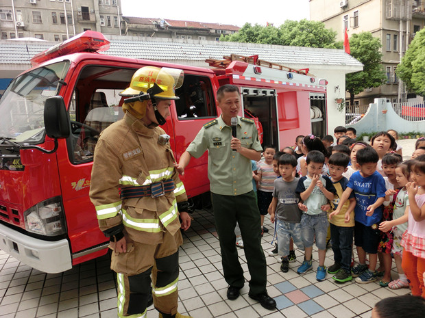 消防员叔叔还给小朋友们介绍了他们的衣着装备:消防头盔、消防服、消防腰带、消防绳和消防安全鞋的特殊功用。现场表演了迅速穿脱消防服并对水枪、消防电锯的使用进行了现场演示。最后,老师带领孩子们近距离地认识消防车。消防员叔叔耐心热情地一一解答了孩子们的疑问,并与孩子合影留念。