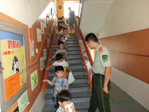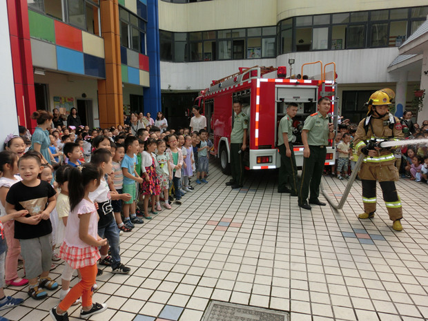 上午9:30,随着安全警报的响起,幼儿园领导小组成员以及消防大队的消防员迅速到指定位置协助孩子疏散,各班教师快速、有序地依据规定的路线带领幼儿用湿毛巾捂住口鼻、弯下身体,冷静、有序地快步下楼到操场,整个演习做到有秩序、行动快速,配合默契,用时2分10秒。