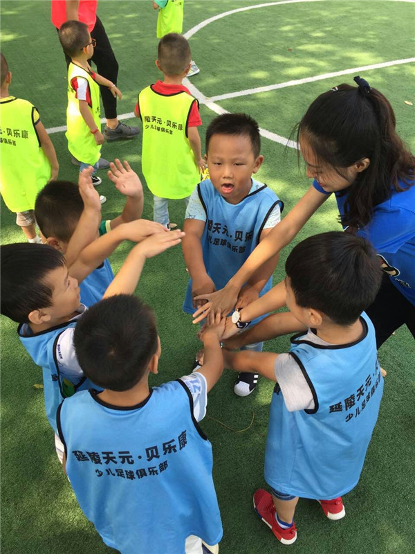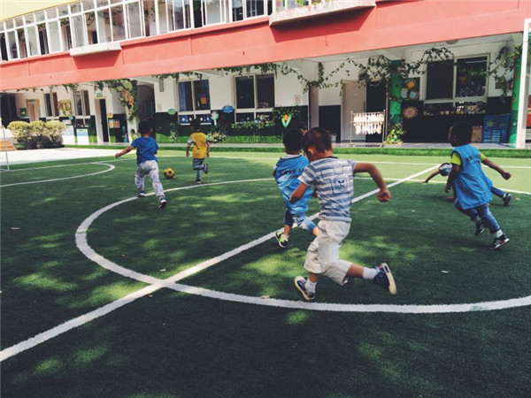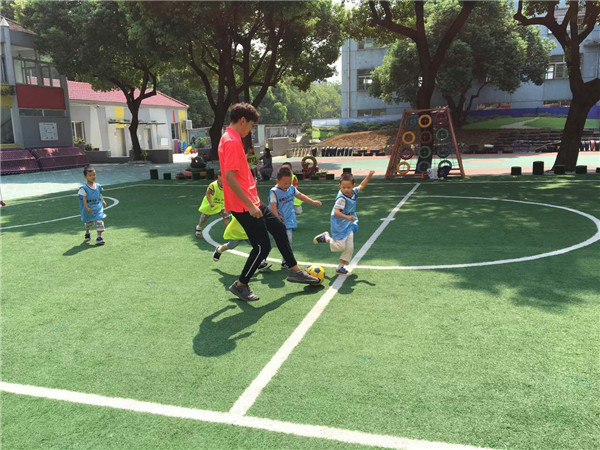 教练是个年轻的小伙子,在简单讲明带球入门洞规则后,便请孩子们尝试带球跑。10个小朋友一组,分成两队进行游戏。半小时过去了,球场上面孩子们兴奋地奔跑、追逐,一个个小脸红扑扑的,晶莹的汗水挂在鼻尖,彰显着无限的生命与活力。第一次接触足球游戏,孩子们则显得并不陌生,奔跑中孩子们还采用轮流做守门员,主动迎面断球,三人围攻等等方式进行游戏,仿佛都是老手一般默契,顿时让我们“观众”傻了眼。虽然活动中有几个小朋友摔倒了,撞疼了,可是足球的魅力就是如此神奇,孩子们拍拍身上的灰土又加入了“战斗”,让我们为之感动与骄傲。