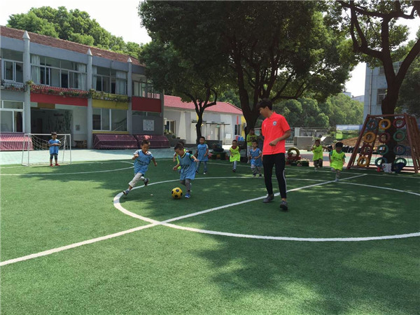在孩子们的欢声笑语中,半个小时的足球训练已经接近尾声了,听教练说,以后中班年级采取也可采取分段式分类学习,有计划、有步骤地“玩球”,进行各种各样的带球游戏中,如:把场景设计为“护送猪宝宝回家”,又利用充气人偶替代球门门柱,孩子们多练习几次射门也不会厌倦。让孩子们“在不知不觉中”掌握专业足球运动技巧与规则。