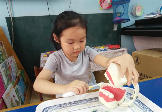其次,通过结合蒙氏教学里的日常工作区活动——刷牙齿。“刷,刷,刷,刷出洁白的牙齿”,帮助孩子掌握正确的刷牙方法,让孩子在寓教于乐中了解其含义。