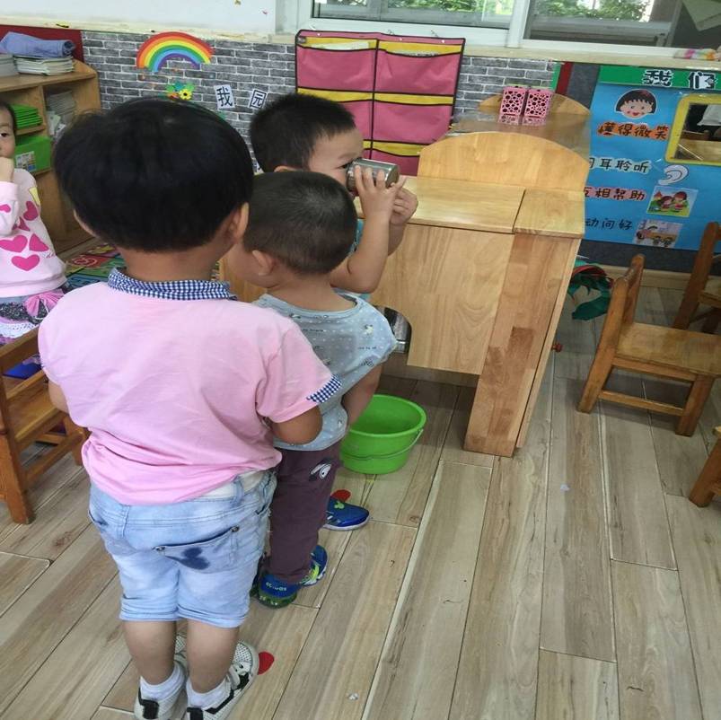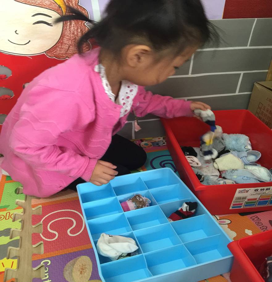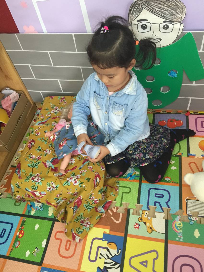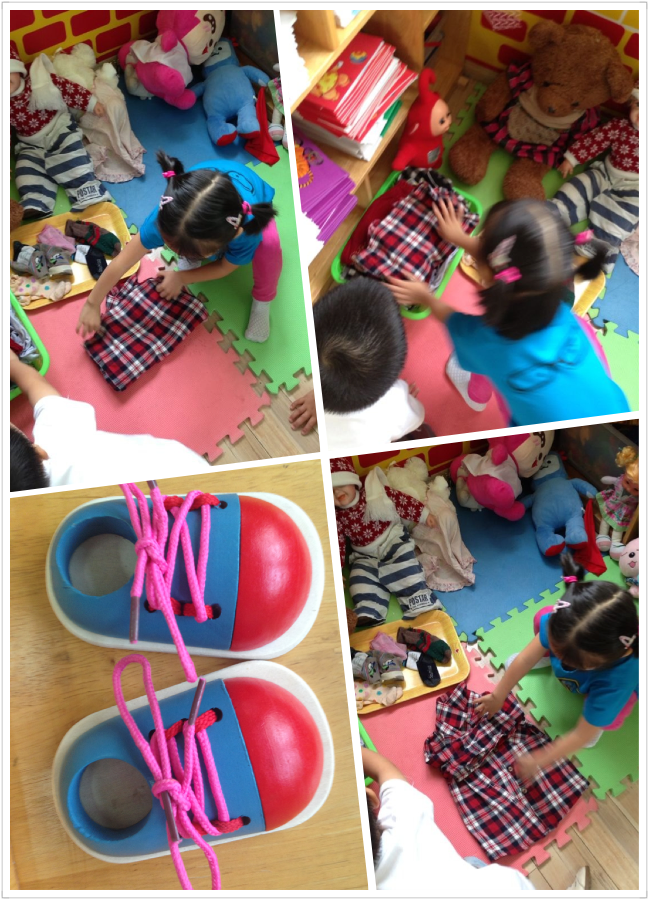 而今天你再来看看这群小宝贝,你看,有的宝贝在那边正在给小娃娃穿鞋子呢!有的宝贝正在扣纽扣,还有的排好队伍正在喝水呢。