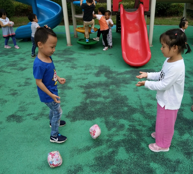 活动中,小三班的老师根据孩子的年龄特点,为孩子们精心准备了丰富的晨间户外活动材料,以走、跑、跳、投掷等基本动作为主,让孩子们在情景中积极、自主参与游戏。如:孩子们在参加游戏“我是小白兔”时,他们能大胆地双脚并拢跳过障碍物;“你抛我接”的游戏,以两两合作互动游戏,深深吸引着孩子;在“抓尾巴”的游戏中,孩子们完全投入到游戏中,多人合作,追逐时的场面非常激烈……一系列的晨间户外游戏,彰显了传统游戏、民间游戏、自编游戏等对孩子们的无限魅力,欢声笑语始终回荡在整个操场。