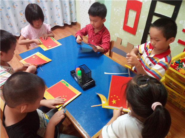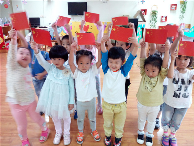 近日,彩虹幼儿园中班级开展了“祖国妈妈我爱你”的主题活动,活动三个部分:一、了解祖国的大好河山,师幼交流会,通过话题交流,师幼问答,以轻松自由的学习环境,进一步引导幼儿了解祖国的成长史,激发幼儿的爱国之情。二、通过认识北京天安门的图片,让幼儿说说自己以前去过的地方?小朋友们都争先恐后的说动物园、大连、等等地方。三、自己动手制作五星红旗,为了让孩子们进一步了解中国的国旗——五星红旗,培养孩子的爱国情怀,中五班的幼儿一起动手制作了漂亮的五星红旗,庆祝祖国的生日。孩子们在国旗上粘贴五角星虽然有的歪歪扭扭,但他们做得很认真,忙得不亦乐乎,在他们的努力下,一面面鲜艳的五星红旗诞生了,五星红旗映着孩子们开心的笑脸,更加显得喜气洋洋,当在自己的努力下完成了国旗制作的时候,孩子们情不自禁地挥动着国旗,流露出开心与自豪的笑容。