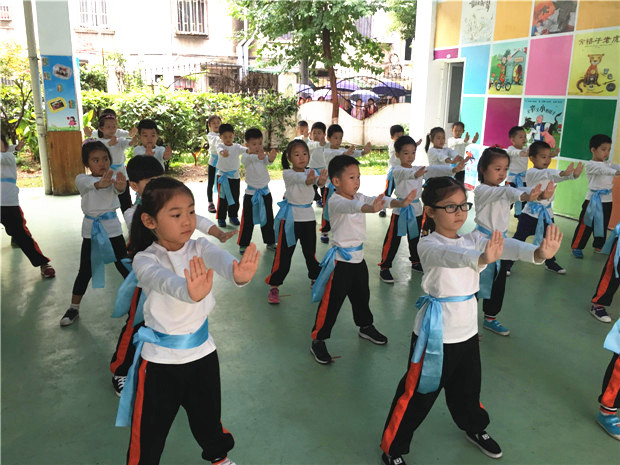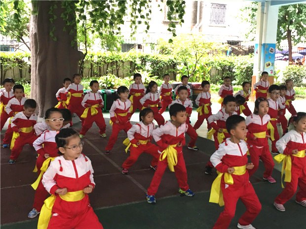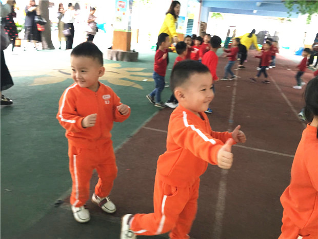 上午8点50分,孩子们准时开赛。看!伴随着铿锵有力的武术操音乐,中大班的孩子们一个个系了各种不同颜色的腰带,整齐划一的做着武术动作;刚入园不到一个月的小班孩子们在老师的带领下也十分投入做着每一个动作,宛若一个个在白云间穿梭的快乐的小精灵!他们个个神气十足,用稚拙的小手、小脚,在音乐声中快乐的摆着、跳着,跳出了欢乐,跳出了可爱,跳出了他们对运动的喜爱,对健康的追求!孩子们认真、专注的神情感染了在场的每一位老师和评委。各班的教师也精神抖擞地分别站在队前与孩子们一起做操,整个操场上洋溢着欢乐的氛围!比赛活动结束,评委们认真、诚实的对各班级早操活动进行了评分。