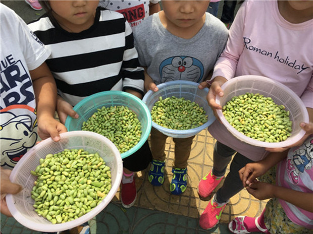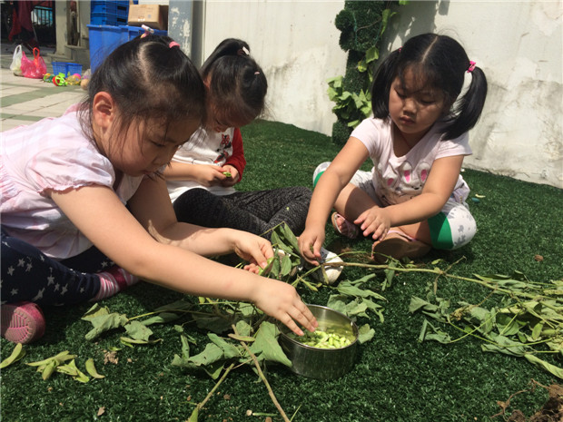 来到种植区,孩子们看见胖乎乎的黄豆荚兴奋无比,个个雀跃欲试,尝试后发现,一揪一大把,用了很大的力气,黄豆杆还是一动也不动,几次尝试后发现一根一根的拔,比较容易拔出来;拔出黄豆杆,孩子进行了剥豆比赛,一共分为四组,孩子自主寻找合作对象,投入紧张的剥豆比赛当中,比赛结束后,孩子们的小手剥得通红,当看见自己碗中的黄豆,个个露出胜利的喜悦!