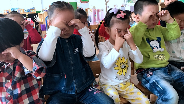 首先,通过生动形象的课件了解眼睛的基本结构和功能,让他们知道如何保护视力。如:多看绿色植物,少看电视和电脑,不要在床上看书,注意用眼卫生等。然后在区域游戏中小朋友给眼睛图上漂亮的颜色,加深对眼睛的认识。最后在舒缓的音乐声中学习做眼睛保健操,让小朋友知道眼睛是很重要的器官,要从小保护好自己的眼睛。