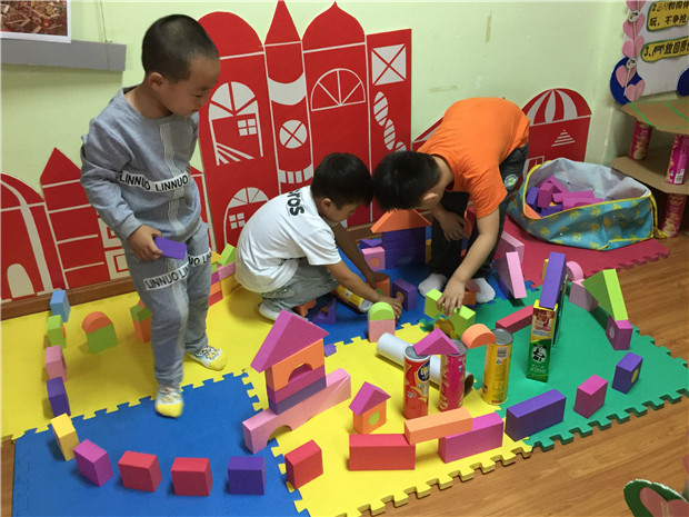 活动中,老师给予幼儿充分的自主空间,根据幼儿的年龄特点,采用了创设情境、提供丰富的材料等多种方法,引导幼儿利用积木、插塑、废旧纸盒、薯片罐、牙膏盒等材料,进行建造、插接,让孩子们在发展动手能力和建构技能的同时,感受到合作游戏的快乐。