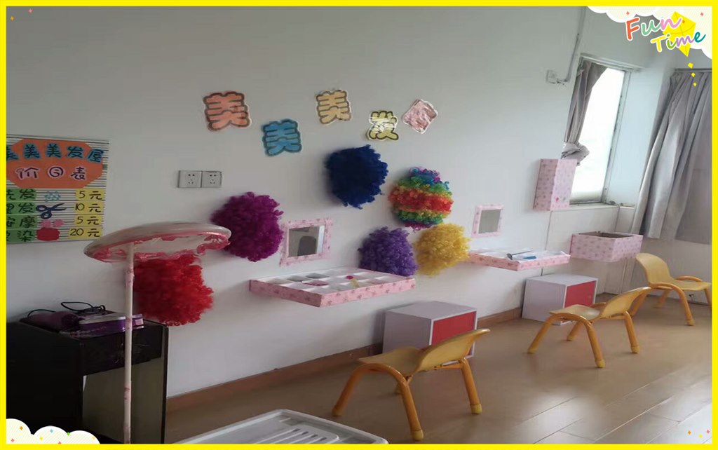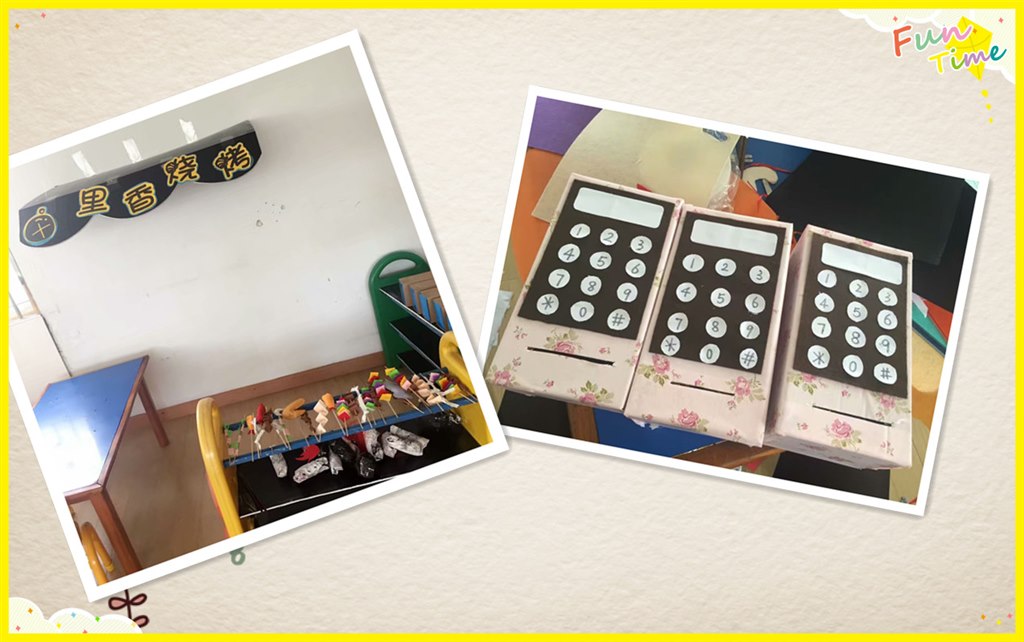 首先,在年级组长带领下,老师们把那些陈旧的、不适用的材料丢弃。然后对各个区域重新划分,根据游戏需要再增添一些道具、场景。把大大小小废旧纸箱变成了各种家电、餐桌、银行、取款机.....丰富了各种自制小吃、烧烤、蔬菜等。温馨的家、功能齐全的医院、琳琅满目的超市、趣味逼真的美发屋等等。创游室焕然一新,让我们眼前一亮。