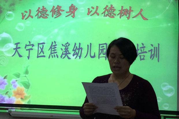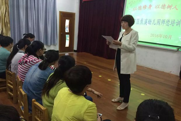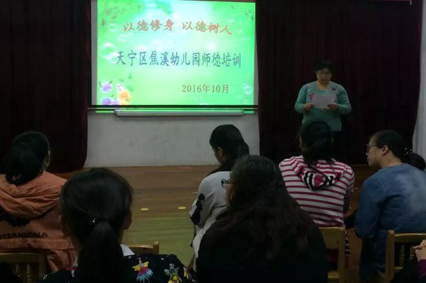 为了进一步推动师德师风建设活动的深入开展,加强教师队伍建设,提高教师的师德和业务水平,努力在教师中营造奋发有为、积极向上的良好氛围,建设一支人民满意的教师队伍。10月13日下午,焦溪幼儿园全体教职员工齐聚一堂,进行了幼儿园师德师风建设的培训活动。