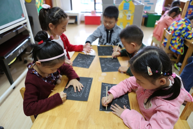 大班的哥哥姐姐们不管在口语表达能力上还是在动手能力上都比弟弟妹妹们强,为此,大班级组的老师们在设计主题活动时更多的是为了提升幼儿创造性思维的发展,提高想象力,发挥幼儿的主体地位。看,孩子们正利用各种废旧纸张、废旧材料创造性地装饰着帐篷,赋予了帐篷新的式样;针对刮蜡画的特殊性,孩子们用手中的牙签表现了黑夜星空下的帐篷节的唯美画面:有的手拉着手围着帐篷唱歌跳舞、有的展示着各种款式的帐篷、有的围坐在老师身边听着去年帐篷节发生的有趣故事……孩子们在每个活动中尽情享受着乐趣的同时促进了全面发展。