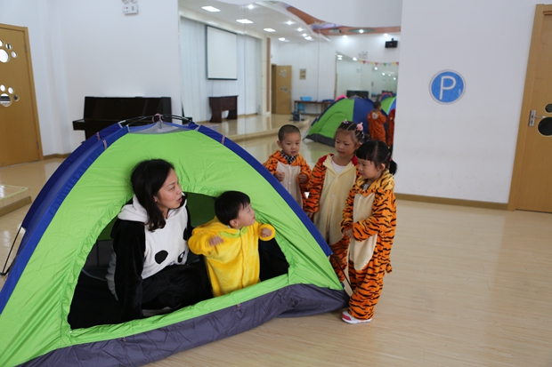 小班幼儿因为年龄特点的原因,无疑是这场活动中最弱的群体,但是他们却不甘落后,在老师的带领下,他们的笑声赋予了原创主题活动生命力。瞧,小一班的孩子们当看到老师扮演的大灰狼扑过来要抓他们时,他们飞快地跑进了帐篷,富有情境下的体育游戏不仅让孩子们感受到了快乐,更是锻炼了幼儿的反应能力;小二班的孩子们和同伴手拉着手一起围着帐篷跳起了欢乐舞,开心的笑容洋溢在脸上;瞧,小三班的小朋友们穿上了动物服装开展了角色游戏,帐篷化身为小动物的家,邀请朋友们一起来做客,在此过程中,孩子们不仅语言表达能力得到了提高,更多的是体验到与同伴一起游戏的快乐,体验到分享的幸福感。