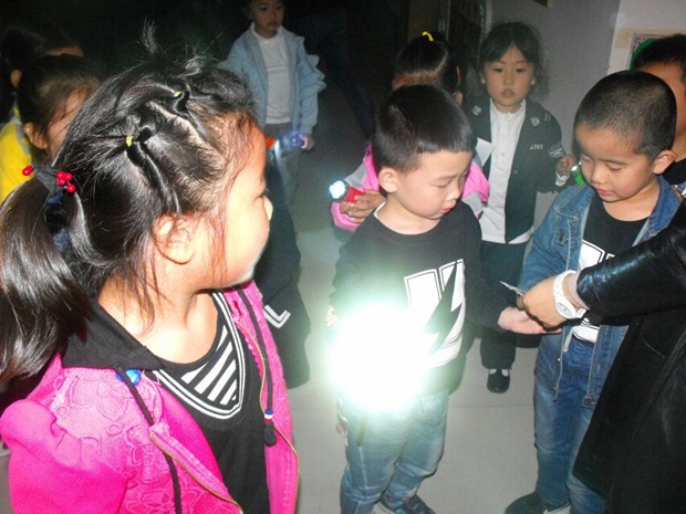 这个环节是孩子们最期待最兴奋的,瞧,他们早已按捺不住激动的心情,五个人一组,凭着手中的线索,在漆黑的幼儿园里利用手电筒的光源找到下一个任务卡所在地,大家一起出谋划策、一起分工合作,在短短半个时间里就找到了分散在幼儿园各个角落的多个“宝藏”,在领取到胜利品之后,孩子们的成功感、自信感、自豪感不予言表。