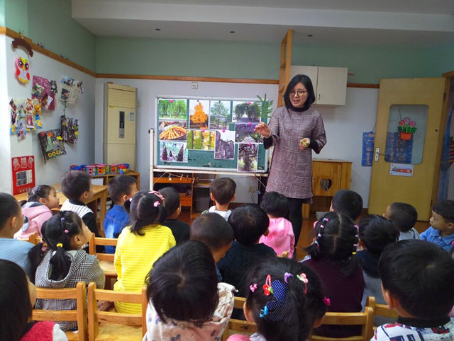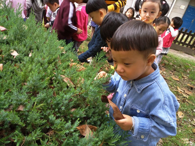 林逸涵妈妈是专业的园林设计师,今天来小金星兆丰幼儿园带小朋友走进秋天,寻找和认识多姿多彩的树叶。当她拿出精心准备的树叶标本的时候,小朋友的目光立刻被深深吸引住了,全神贯注的听着她对各种植物叶子的详细讲解,有火红的枫树叶,墨绿的雪松松针,黄色的银杏树叶,小巧的金边黄杨,珍贵的水杉,纤巧的竹叶,当她拿出大大的广玉兰树叶的时候,还细心的介绍广玉兰树叶背面有小小的绒毛,和其他树叶相比,这也是广玉兰非常独特的地方了。通过认识大树的叶子,孩子们知道哪些大树是常绿树,哪些大树是落叶树,哪些是乔木,哪些是灌木,比如金边黄杨和松树是常绿树,它们的适应性非常强,可以在寒冷的地方生长,能预防水土流失,比如银杏树是落叶乔木,它浑身都是宝,树叶和果实都可以当药材,它还能抗病虫害,是非常珍贵的观赏性植物。比如广玉兰树,不仅叶子美观,开花的时候花儿就像荷花一样美,果实是红色的也非常漂亮,是人们喜爱的观赏性树木,比如还知道哪些大树结的果子可以吃,比如香甜可口的松果就是松树的果实,比如比如银杏树的果子不仅可以吃还可以当药材,但是不是所有的银杏树都能结果子,只有雌树才能结出果子。