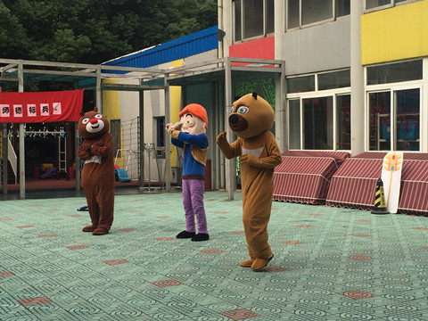 本次演出的剧目是小朋友熟知的动画片《熊出没》中改编后的片段,讲述了熊大和熊二出行旅途中因为没有遵守交通规则而被光头强撞见,继而发生一系列的故事。在短短的二十分钟的表演里,告诉孩子们红灯停,绿灯行,黄灯要慢行的交通安全小常识。