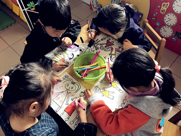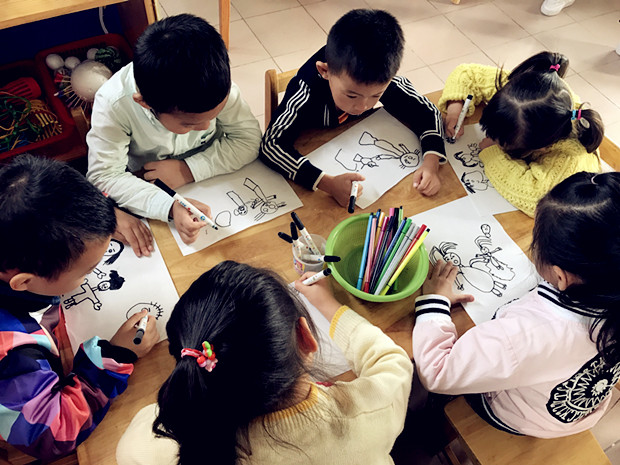 在活动开展之前,教师带领幼儿和小班的弟弟妹妹们手拉手参观教室,激发幼儿对手拉手的兴趣,帮助理解手拉手包含的爱护之情。活动中,教师为幼儿出示了手拉手的图片,幼儿在欣赏中萌发创作的欲望。接着,幼儿在教师的指导下尝试进行绘画多个小人,并表现小人手拉手的形象。在完成小人的形象后,幼儿一个个认真地给小人涂上了自己喜欢的颜色,并在空白处添画了背景。活动后,教师将幼儿的作品展示在黑板上以便大家一起分享交流。