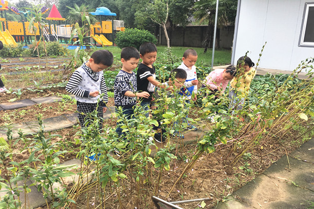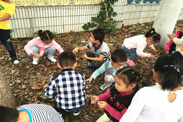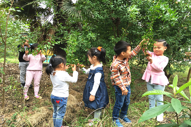 一出教室,孩子们便将绿色的芳草和彩色的花卉尽收眼底。走在一楼长廊,就听见孩子们说:“哇,好香!”“这是桂花的香味!”循着香味找去,孩子们在长廊西面的草坪上看到了两棵大大的桂花树,他们抬起头,使劲地深呼吸,用小鼻子感受着香甜的桂花香味,有的孩子叽叽喳喳地讨论起了吃过的桂花制作的食品,还有人唱起了“八月桂花遍地开……”;路过种植园地,那里有成熟的芝麻、甜高粱、红薯……也有新种的大蒜,萝卜、花菜等,带有植物芳香的泥土,无不在告诉孩子们秋姑娘来啦!孩子们跑上幼儿园的小山坡,几个孩子在大喊:“快来看啊,我们发现石榴了!”孩子们纷纷围上前去,石榴树上真是硕果累累;围墙边大树下,孩子们拾起落叶,在落叶中嬉戏、打闹、欢笑,孩子们这儿瞅瞅,那儿闻闻,一路欢歌笑语相伴,此情此景是多么美好、多么欢乐!孩子们每到一处都有新发现,每到一处都有新收获。孩子们尽情探索,感受着幼儿园秋天的浓浓秋意。