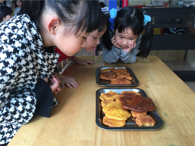 小朋友们把南瓜摘下来,自己洗南瓜,将南瓜切开,挖出瓜瓤,再放进锅里加水煮熟。切好的南瓜经过蒸煮都成了泥状。在碗里放四勺米粉,一勺南瓜泥,一勺白糖,孩子们尝试着自己和面。稀了加点粉,干了和点南瓜泥。经过长时间的翻转和搓揉,碗里的粉和泥终于变成了团状,孩子都甩着手直呼不易。把面团分成几个小团,你搓我揉大家都使出浑身解数,看看你的比比我的,个个神采飞扬,再把小团搓圆、压扁,模子一盖,一个南瓜饼就成型了。想着自己亲手制作的南瓜饼可以成为美味的食物,孩子们脸上充满了期待。不一会儿,香喷喷的南瓜饼出锅了,黄澄澄的真诱人,咬一口软软的甜甜的真好吃,孩子们吃的真开心,欢笑声此起彼伏。