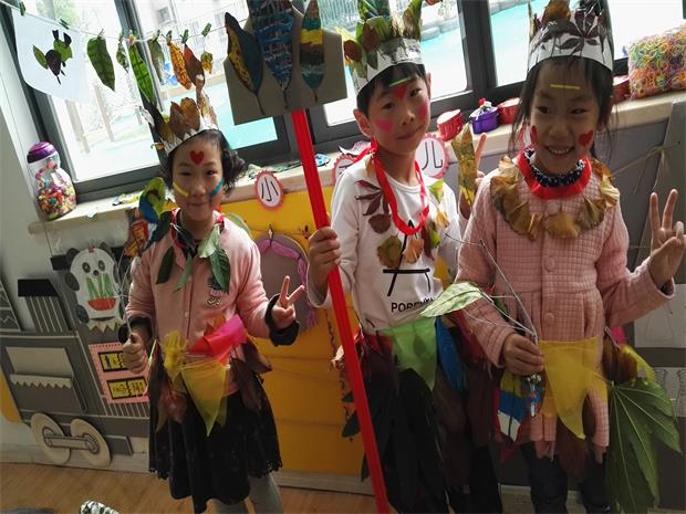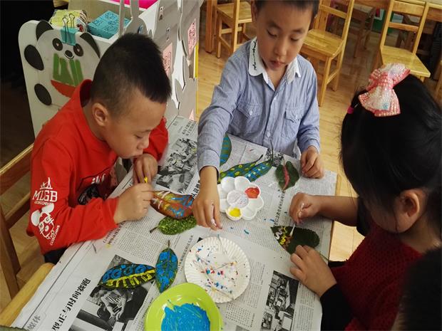 在落满树叶的操场上,孩子们会三五成群地簇拥而蹲,指点着、交流着落叶的形状、颜色和名称;“捡落叶、撒落叶”是多么有趣的体育游戏啊,“捡着、抛着、跳着、笑着、叫着……”连接起孩子们和小树叶之间无形又相通的快乐,分不清是落叶娃娃还是娃娃落叶;美工区里,孩子们带着新鲜和好奇,蘸着颜料手舞画笔在给落叶们换“新装”,五彩的颜料不仅让干枯的落叶霎时变得光彩夺目,也让小叶子们焕然一新,组成可爱的化画作;表演区里,快来做“落叶帽”“落叶衣”,跳起原始的“印第安舞”,更是美哉妙哉;娃娃家里,落叶还“变身”成了孩子们的游戏食物,大家正津津有味地“品尝”着“落叶盛餐”……