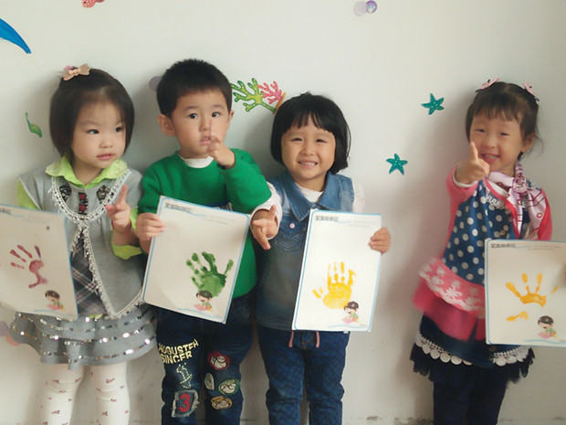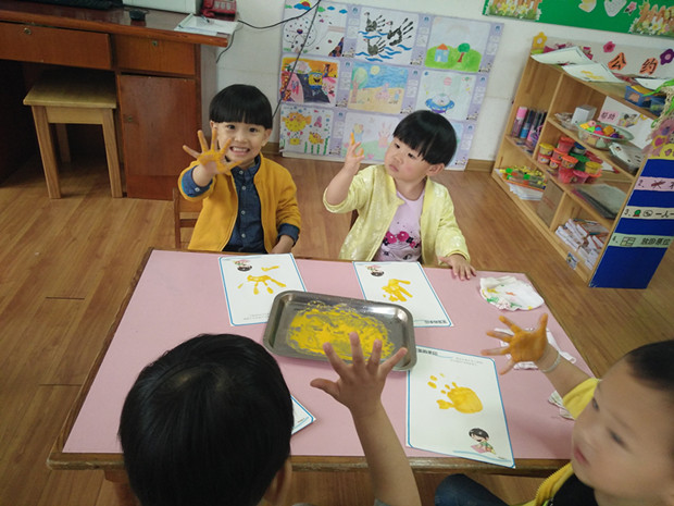 在活动中,幼儿说出自己喜欢的颜色,找一找身边的美丽颜色,接着在老师的指导下,用小手印画。幼儿们刚开始充满了好奇,小心翼翼地用小手染上颜料,看着手上的美丽,欣喜并期待着。不一会,一个个颜色各异,形态可爱的小手掌跃然纸上了。