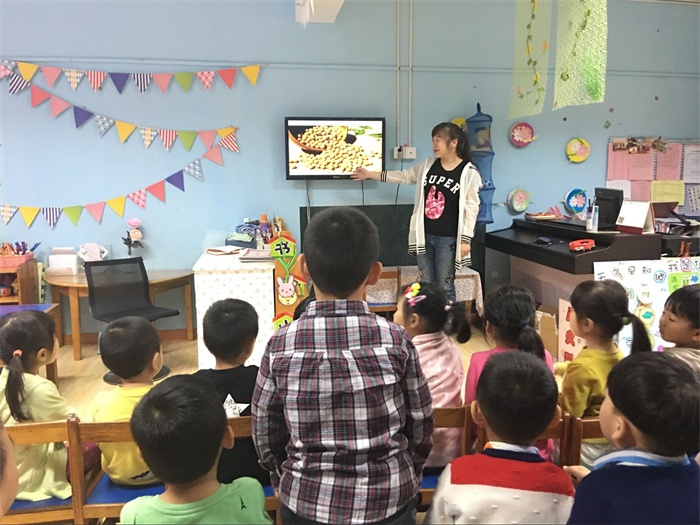 在老师的组织下,随着老师的一句“你知道哪些是粮食吗?”打开了孩子们的话题。“老师,我每天吃的米饭是粮食”、“老师,面条是粮食。”……在老师指导下孩子们认识了五谷杂粮,认识了稻子、高粱、番薯、黄豆、小麦等各种农作物,并了解了各种不同粮食谷物的延伸制品。“老师,为什么这个米是红色的呢?”“老师,这个又是什么?”孩子们通过互相交流,询问,知道了一些平时都不常看到的五谷杂粮,增长了不少知识。紧接着老师组织孩子们学习了古诗《悯农》和故事视频《大公鸡和漏嘴巴》,进一步让孩子们了解了农民伯伯种粮食的辛苦和粮食的来之不易,并初步产生了节约、爱惜粮食的想法和意识。