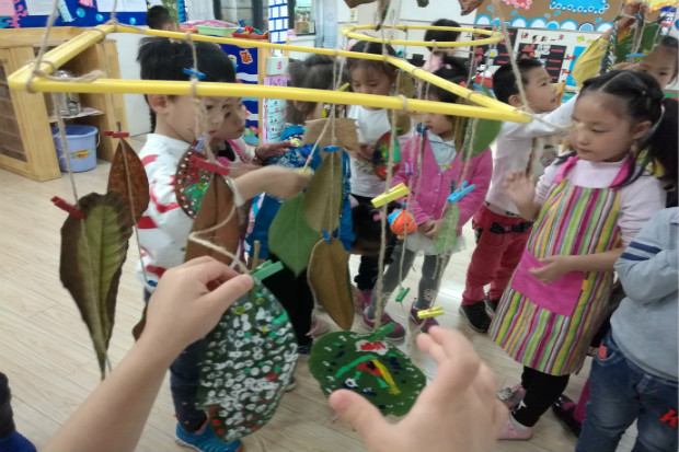结合我园园本课程,由中四班陆老师开展的美术活动《树叶风铃》中,老师创设了小树叶离开妈妈的情境,孩子们惊喜的发现树叶有各种各样的形状,老师鼓励孩子们想象树叶的形状像什么,激发孩子们的想象力。并引导幼儿用点、线、色块彩绘树叶,表现树叶的色彩美,最后孩子们将自己展开想象绘制的树叶悬挂起来,制作成“树叶风铃”的时候,孩子们显得那么的惊奇又激动,别样的创意活动给大家带来了别样的惊喜。在活动的最后环节中,孩子们共同分享、交流、感受,大家互欣互赏,共同领略“树叶别样创意”带来的乐趣。