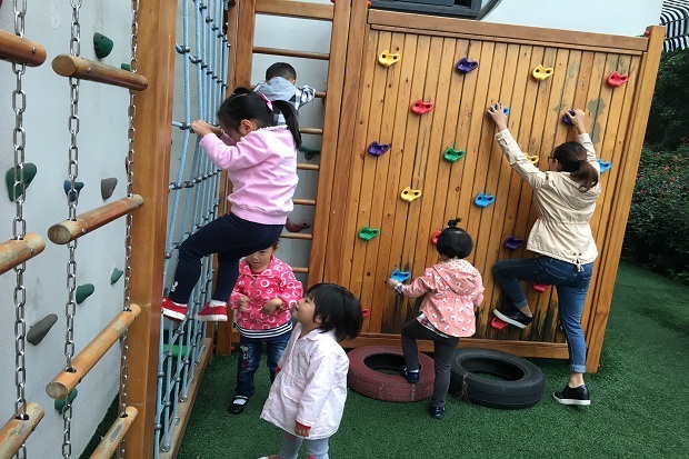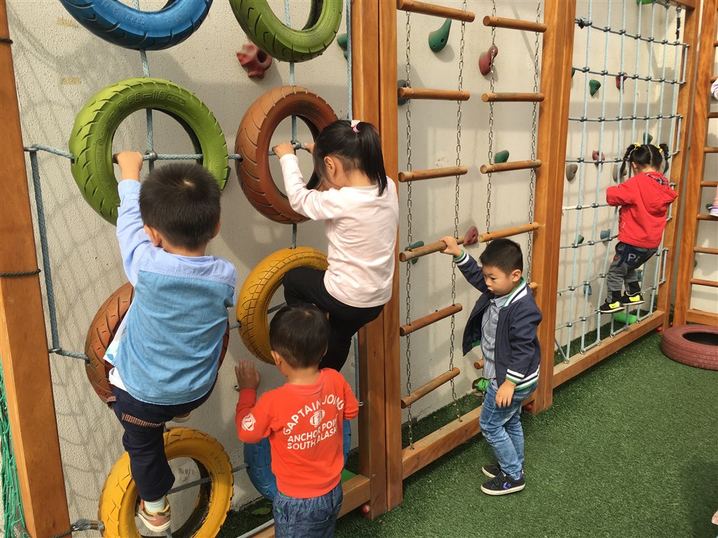 在老师的引导下,通过几次的尝试练习,孩子们越来越喜欢攀爬活动,并熟悉了攀爬活动的安全注意事项。他们攀爬比自己身高还高大的攀爬墙,攀爬过程中,手眼协调,手脚并用,是放弃、还是继续坚持?已经不全然只有勇气可形容,还有意志力、荣誉感及自我超越的决心。当爬到顶峰的那一刻,那种战胜自己,克服一切困难的成功与喜悦已了然于心,从而激发他们新的挑战欲望及热情。