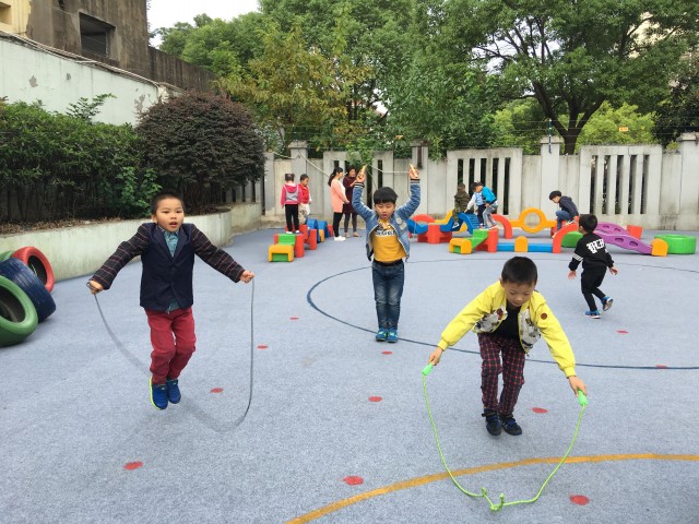 快乐的一天就这样在趣味的运动中开始了,孩子们时而钻、时而跳、时而踩高跷、时而投球,还有跳绳,玩得不亦乐乎。我们对活动进行科学合理的组织与调控,使孩子们得到了积极有效的锻炼。这种开放式的锻炼,让孩子们不再局限在规定的一方小天地,不再在老师的指挥棒下运动,他们可以玩到更多的器具,真正做晨间锻炼的主人。(撰稿:颜裕婷)