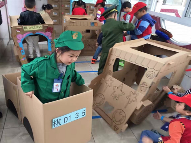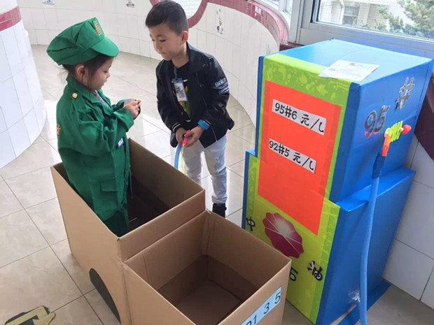 一群扮演顾客的孩子拿着“纸币”在各个角色区消费,每消费一次就能获得一个积分,满两个积分就能去“幸运大转盘”抽奖,获得的礼品就会被送到“飞马快递公司”接单打包。各个角色区之间相互联系,为孩子们互动式的交往、体验建立了循环的纽带。
