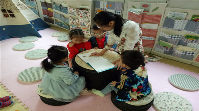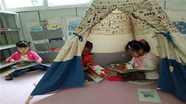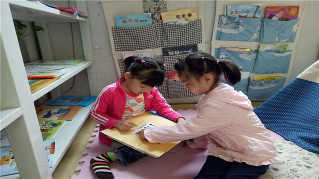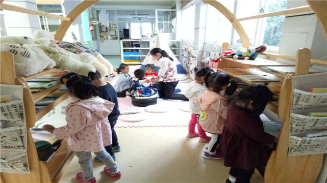 小班的孩子爱模仿老师,于是,每次进入这里时,实幼的老师们都会和孩子一起读书,有时候会放上舒缓的背景音乐,小声的和孩子们交流……这一切都成为孩子们模仿的对象,在安静的氛围中孩子们对书本有了阅读的渴望。