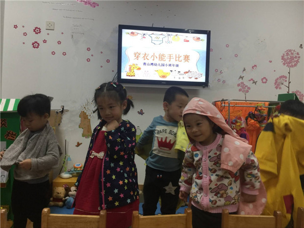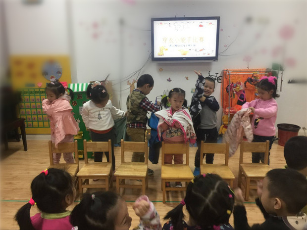 为了培养孩子们良好的动手能力,我们小班年级的孩子们开展了一场别开生面的穿衣服比赛。为了这次穿衣比赛,小班年级的老师们做足了充分的准备:她们不仅事先制定了详细的比赛方案、而且还于赛前对幼儿传授了正确的穿衣方法;不仅请家长配合,利用空闲时间对幼儿的穿衣技能进行了复习和指导。在比赛活动中,别看小班的孩子年龄小,可是表现出来的拼搏精神可一点都不差。随着“预备——开始!”的指令声,参赛幼儿一个个积极地投入到了比赛中,你看他们有的穿衣服的动作迅速利落、有的动作有些笨拙迟缓、有的紧张的纽扣扣错了,还有的找不到另外一只衣袖管了……在一旁观战的其他幼儿主动当起了拉拉队,给参赛的小选手们加油鼓劲。此时教室里的加油声、呐喊声此起彼伏、热闹非凡。在小伙伴们的加油声中,每个宝贝都尽了自己最大的努力,独立完成了穿衣过程,并获得了令人可喜的成绩。