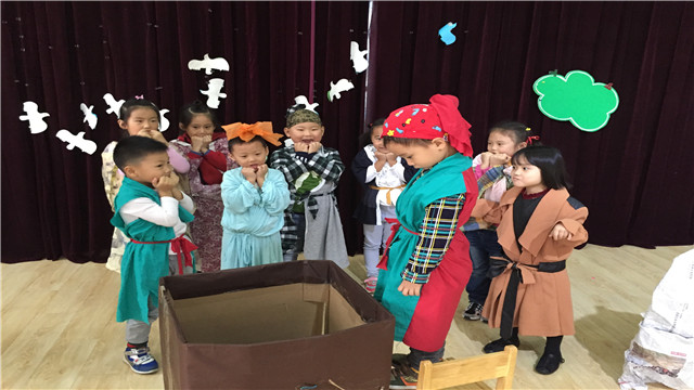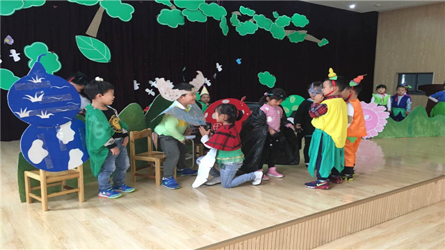 本次民俗节活动从编剧本到导演、排练,以及制作道具,都以孩子自主活动为主,教师作为协助者帮助幼儿完成游戏。台上的孩子们卖力地演,台下的“小观众们”也是认真地看,孩子们的精彩表演赢得小观众们和老师们的阵阵掌声。
