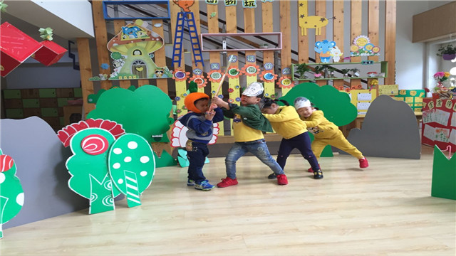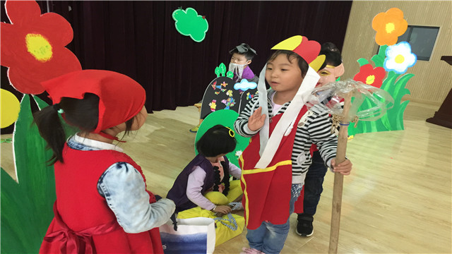 游戏正式拉开帷幕啦,小二、小三班的宝贝们选择表演故事情节简单、对话重复的故事《拔萝卜》,虽然在游戏中表现得很稚嫩,但是他们个个玩得很开心。大班的孩子们选择了故事情节复杂、易于创编、富有教育意义的民间老故事进行表演,如大一班表演了《司马光砸缸》,瞧,孩子们身着长袍,头扎小辫,为就落水的小朋友而想方设法;大二班的《葫芦娃》,孩子们一个个化身葫芦娃,与蝎子精、蛇精斗智斗勇;大三班的《三打白骨精》,你是唐僧身披袈裟;我是孙悟空牵白马,他是沙僧挑着担,一路向西去取经;在孩子们的表演中,在家长亲手制作了各类栩栩如生的衣服和道具中,故事活了,人物亮了。孩子在一定的游戏环境中,在与表演材料、伙伴、成人的互动中不断主动探索,建构统整经验,体验快乐情绪,从角色表达开始,到情景创作,进而推进合作表演的过程。从而使他们的语言表达能力、思维想象能力、动手操作能力等均得到锻炼和提高。