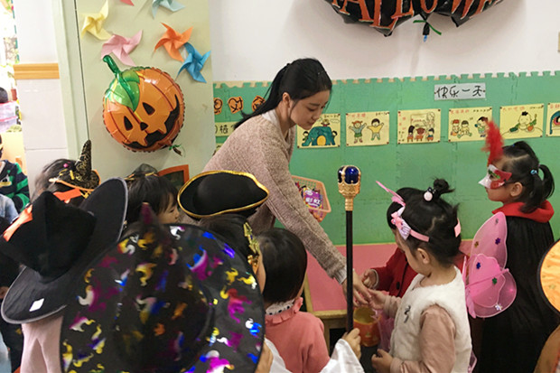 “不给糖就捣乱”“不给糖就捣乱”讨糖啦!一个个小魔怪们,围着老师要起糖来,要到糖的小魔怪们拿着糖心满意足地走了。