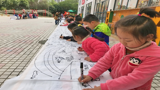本次活动是以现场作画的形式开展。每个小朋友都进行巧妙的构思,在优美的乐曲声中,孩子们有的挥笔勾线,有的泼墨涂色,争相在百米画卷上一展风采。短短一小时内,一幅幅充满童趣,极富想象的环保创意画呈现在大家面前。画卷上,蓝天白云,青青草坪,一笔一划都流露出大家对绿色家园的美好畅想。多彩的画笔牵动着孩子的梦想,绚丽的画卷承载着孩子的未来。小小的图案承载着他们丰富的想像,绘出了色彩鲜艳的画卷。此次活动旨在发挥了孩子们的想像力、锻炼了意志,提高了审美能力,并促进了合作探究的意识。