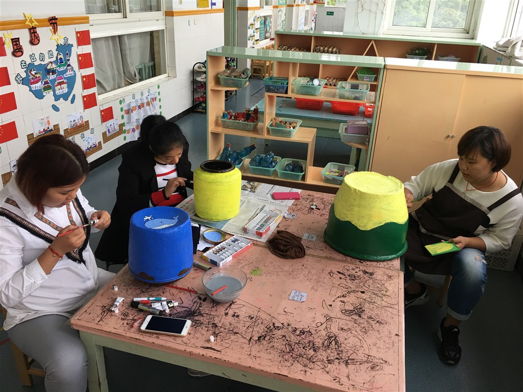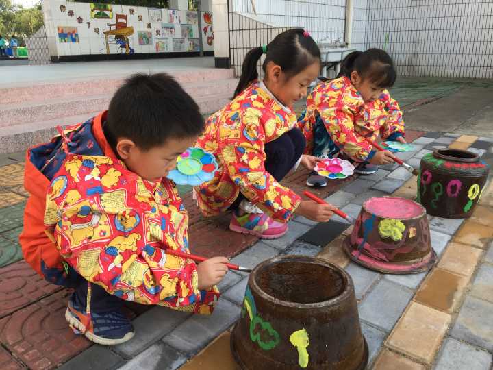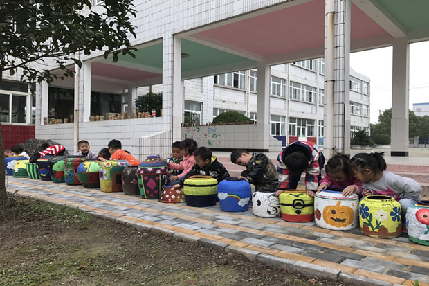 瓮头是我们农村生活中常见的东西,废旧的瓮头放置起来很占空间,但丢弃掉却又很可惜。于是,我们利用自己的专业特长,发挥聪明的头脑与创意热情,给瓮头画上了漂亮的图案,让废旧瓮头变成充满童趣的艺术作品,体现了巧妙的创意和变废为宝的环保理念。最后将它们展示在幼儿园长廊上的涂鸦区。孩子们看到了,各个兴趣盎然,也拿起小画笔在瓮头上面勾勾画画,画出了哆啦A梦、小黄人、小火车、彩色泡泡、海底世界、小青蛙、蓝色星空等,亲身体验到了创意绘画的乐趣。