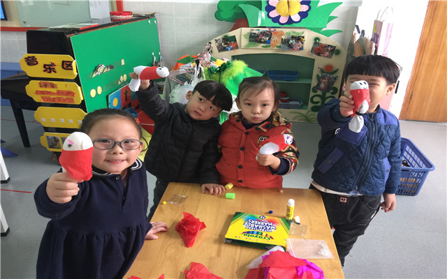 活动开始,崔妈妈给孩子们生动的讲述了小红帽的故事,孩子们听得津津有味,当崔妈妈提出要带他们一起用袜子做小红帽的时候,孩子们表现出极大的兴趣。在制作过程中,孩子们和崔妈妈一起利用袜子、皮筋、绒球等材料进行创意制作,孩子们和妈妈一起奇思妙想,一个个不起眼的小材料,在一双双灵巧的双手上,立刻就变得可爱、生动充满了生命力,看到自己的作品,孩子们不禁自豪地说:“阿姨,这是我做的!”“老师,你看我做的像不像!”孩子们无比骄傲,在他们脸上洋溢的是满满的幸福与成就。让孩子们在亲自动手制作的过程中明白原来有的废旧物品是可以再利用的,充分发挥了幼儿的想象力和创造力,并锻炼了幼儿的动手能力。