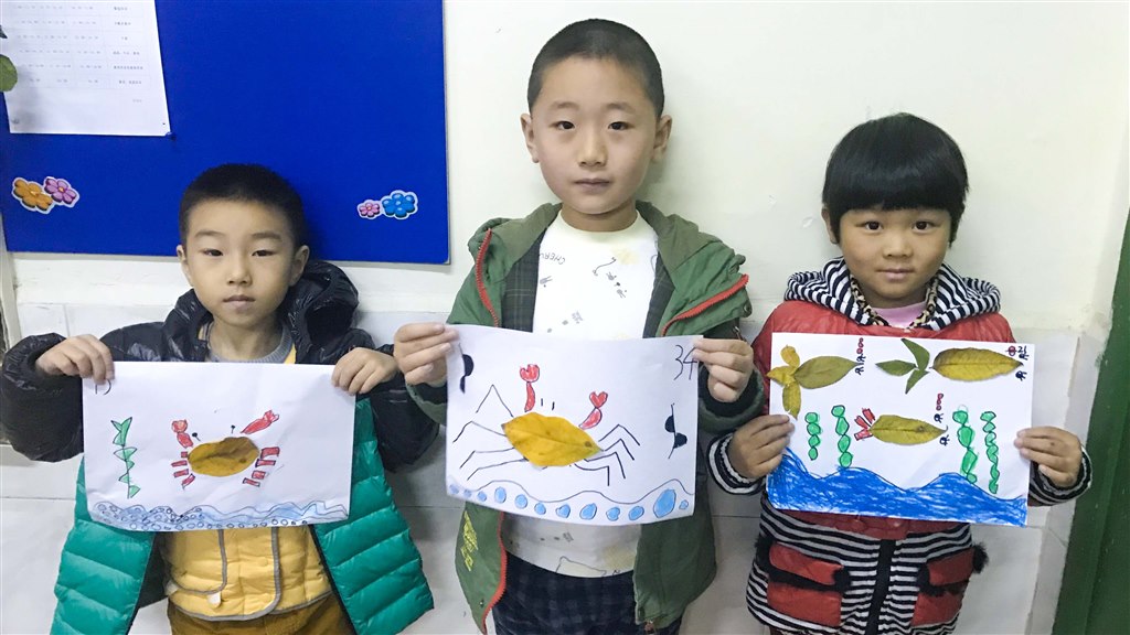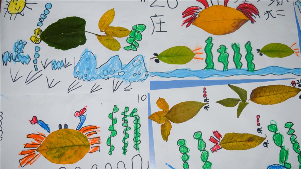 瞧,孩子们创作得多专注啊!有的画、有的涂、有的撕、有的粘,运用多种方式相结合,充分发挥着自己的想像力,有的用落叶做成了一只大螃蟹,有的用落叶做成了一条条活灵活现的小鱼……那一幅幅作品充分展现出孩子们惊人的想象力和独特的构思,使孩子们收获了成功的快乐。
