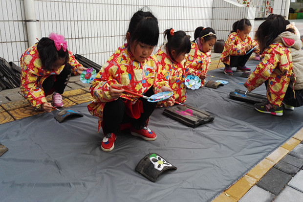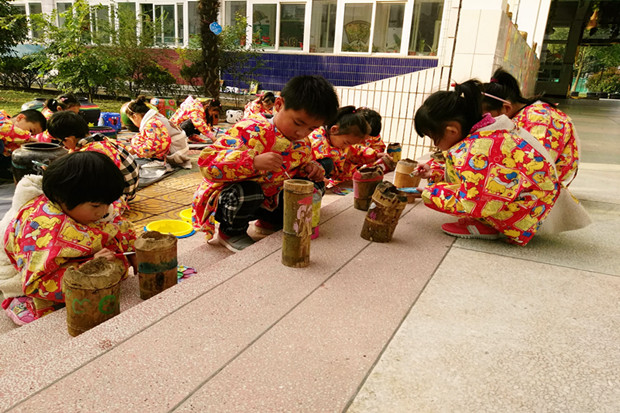 在涂鸦区中,孩子们积极自主,创造着属于他们自己的作品。他们手里拿着画笔,想象着、绘制着……俨然是一群小魔术师。看!有的孩子两两结对,拿起小画笔在瓮头上面勾勾画画;有的则是在竹筒上仔细的装饰着,给它们穿上漂亮的衣服;还有的则是在瓦片上和墙面上绘画,画出了可爱的小动物、五彩的花儿、神秘的海底世界等。孩子的大脑充满着超凡的创造与想象力。简单的点、线在他们的彩色画笔下就能成为令人惊叹的神奇世界。