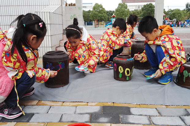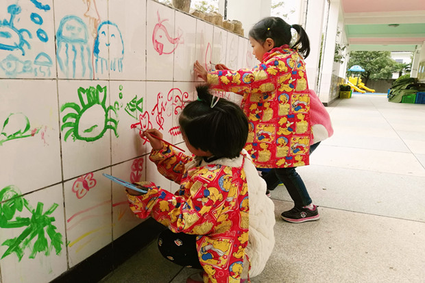 涂鸦对于孩子来说是一种游戏,一种轻松的不受限制的绘画形式。近日三河口幼儿园的老师集思广益,利用一楼长廊的墙面以及废弃的瓮头、瓦片、竹筒等废旧材料打造成了有艺术性的“创意涂鸦区”。