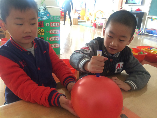 结合《指南》精神,老师们深刻了解:幼儿是科学探索活动的主体,而幼儿的经验来源于生活、来源于周围环境。正是基于幼儿是通过直接经验来认识事物以及他们对现实世界所特有的强烈的好奇心和探究欲望等特点,我们开展了《扎不破的气球》科学探索活动。活动中,我们为孩子们提供了大量的气球,本着“自由——引导式探索”的教学原则,给孩子充分的探索空间,鼓励他们自主结伴,吹一吹、看一看、比一比,在观察——探索——发现问题——提出疑问——共同讨论中,发现气球的许多秘密,明白气球爆炸的原理,增长见识,自我建构知识经验。