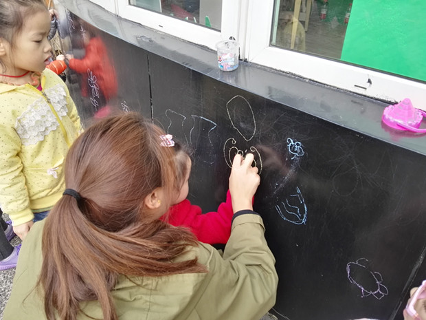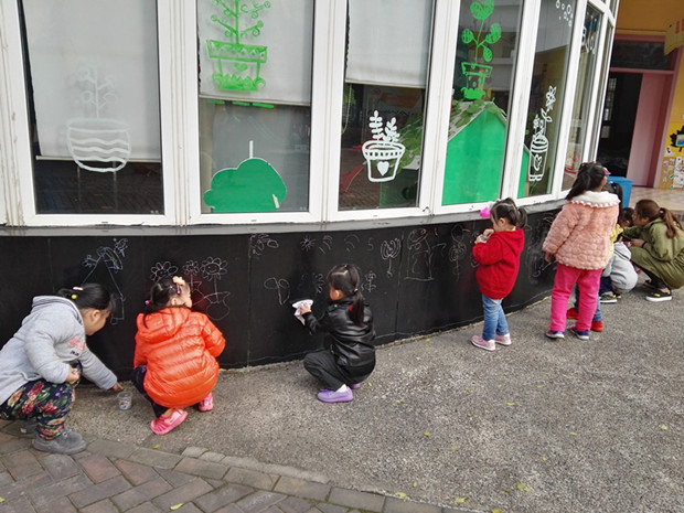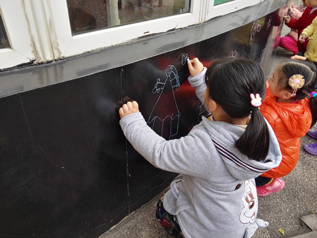 幼儿期是书写绘画敏感期,也是孩子审美与艺术感觉培养的关键时期。为了发挥孩子们在这个时期的书写涂鸦能力,我园特意给孩子们在外墙创设了一个涂鸦墙,让孩子们能在涂鸦墙上自由创作,很好的提升了幼儿的想象力和动手能力,也增强了孩子们的自信心。