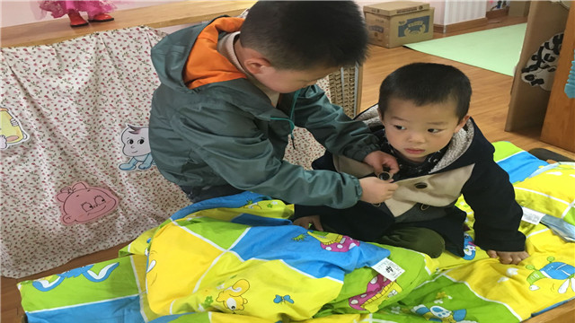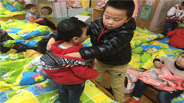 天气逐渐转冷了,小班的弟弟妹妹是第一次在幼儿园度过冬天,外套、裤子和鞋子穿起来好慢呀!怎么办?“没关系,有我们呢!”这时,大班的哥哥姐姐们会早起几分钟,带着他们的热情来帮小班的弟弟妹妹们穿衣服啦!这就是彩虹幼儿园大班小班年级,联合组织开展的为期一周的“大带小”穿衣活动。瞧,大班的哥哥姐姐认真仔细的把弟弟妹妹的衣袖翻正,帮他们穿起来,拉拉链、翻帽子、拔鞋子……还热情地帮他们叠被子,做起事来有模有样,非常贴心。