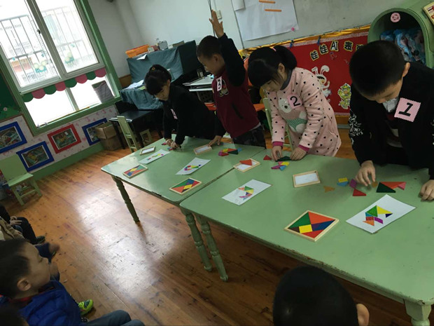为了比赛的顺利开展,在活动前几天,老师就准备了很多七巧板的样板图片,让幼儿进行赛前的练习,并把将开展比赛活动预先告知了他们。当孩子们知道有这个大赛的活动时,对每一次的练习活动更加的专注、认真。只要一到区角游戏时间,自己找出相关的图片认真的练习,有问题就与同伴老师交流,拼造出很多不同造型的图例。