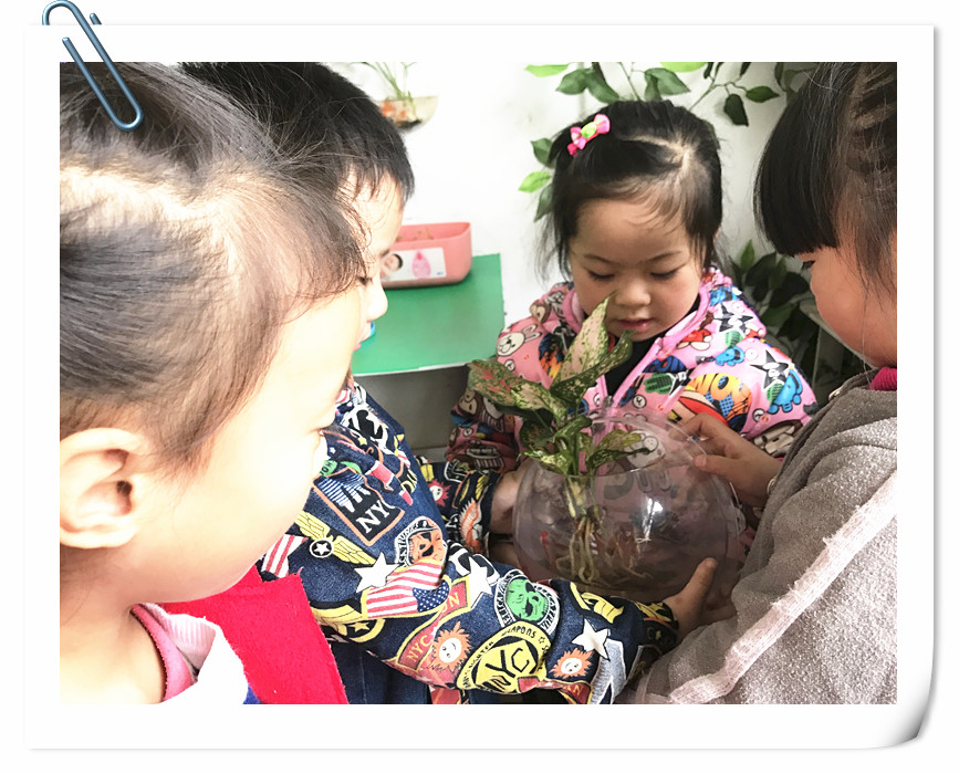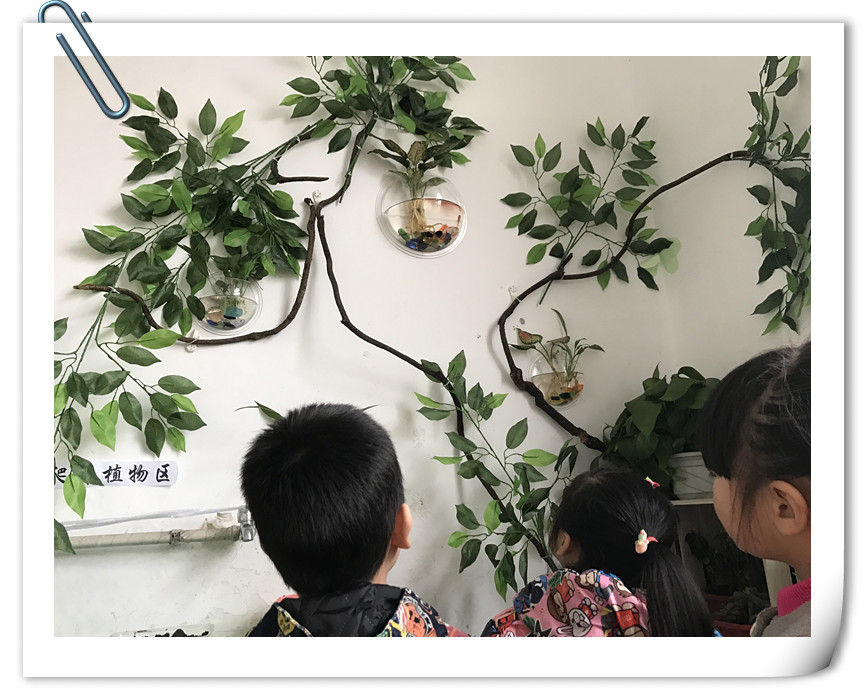 近期,在家长的大力支持下,茶山幼朵朵一班利用走廊转角增设了一个绿色的小天地,小朋友们从家里带来黄豆、纳豆、花生和大蒜,用自己的小手把它们种进泥土里;在老师的帮助下把藤蔓移植到墙上固定;小金鱼和水培植物一起放进了透明的半圆鱼缸装到墙上。每当有其他班的小朋友和老师经过的时候,都会说:“哇,好神奇呀,鱼儿在墙上游呢!”