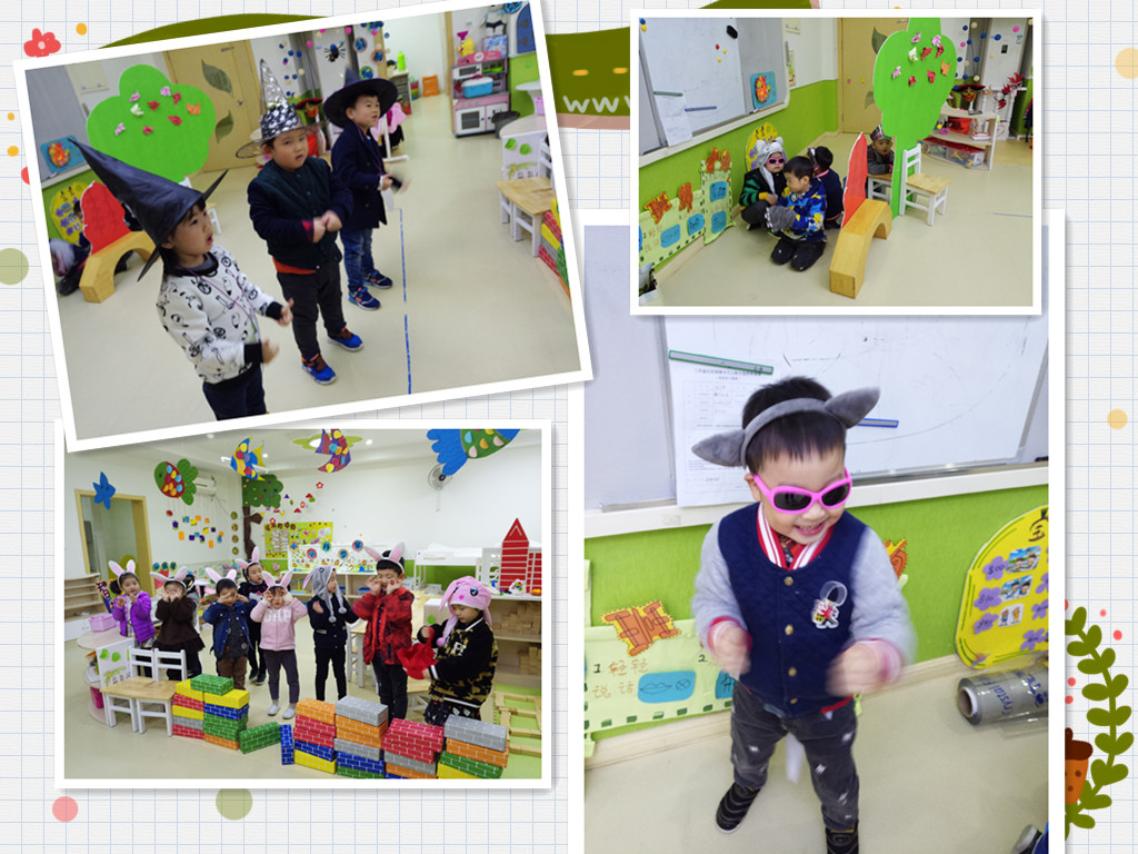 画完妆的“小演员”们更起劲了,听着音乐就表演起来了,大灰狼说:“小兔子!快开门呀!我是你们的妈妈!”小兔子们则机智地说:“你才不是我的妈妈呢!我的妈妈可不带墨镜!我妈妈有时尚的包包!”一句句孩子自编的台词,引得大家连连发笑。